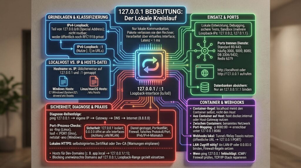 Sie ist Dein sicherer, schneller Standard-Endpunkt für lokale Dienste, Tests, Debugging, Datenbanken und Netzwerkdiagnose – ohne externe Abhängigkeiten.