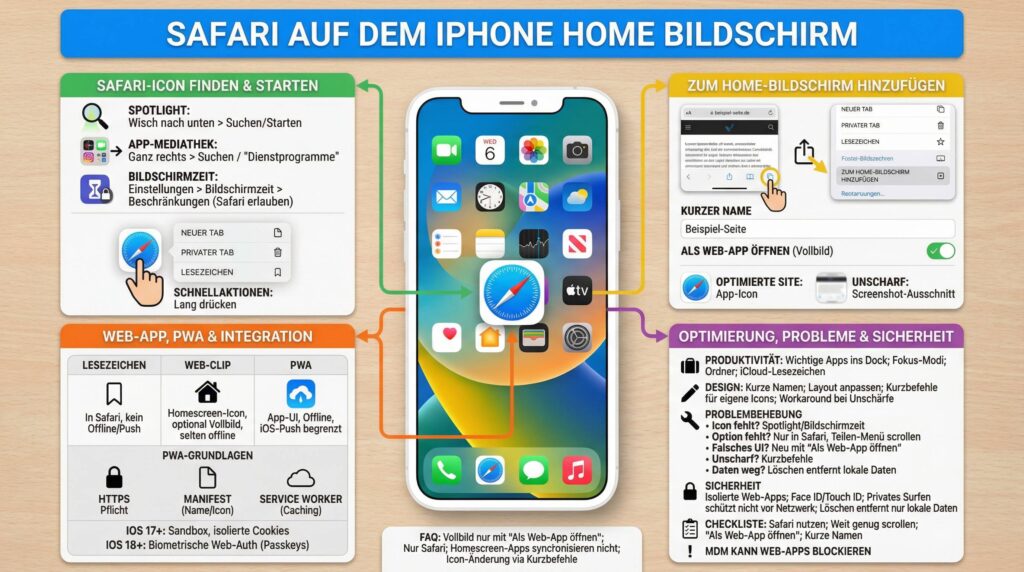 | Safari-App | Direkter Start des Browsers | Immer mit Safari-UI | System-Icon, fester Name | Browserabhängig | Safari-abhängig | Safari-Profile |